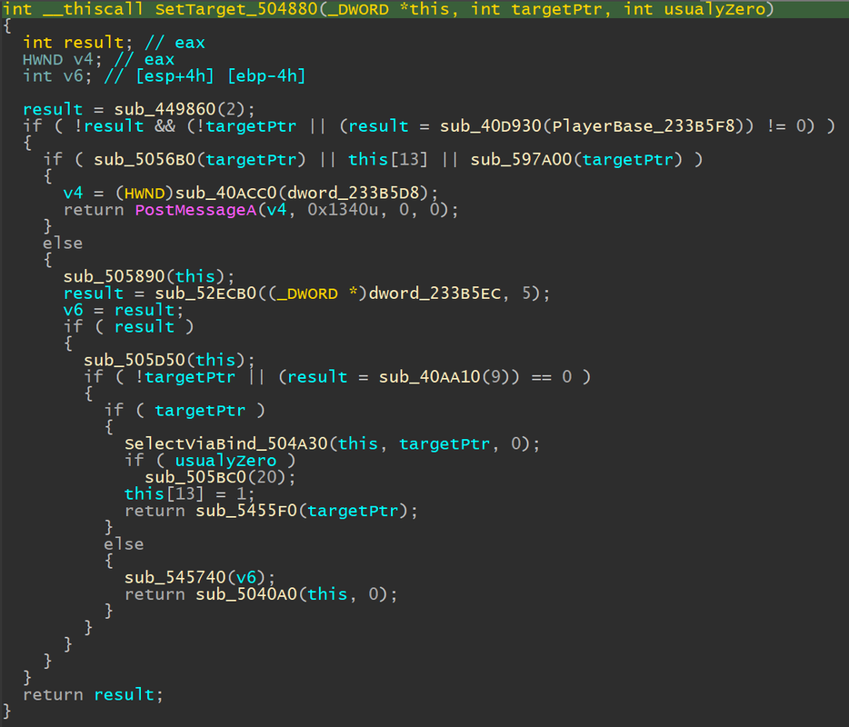 - Хукнуться, чтобы трекать, что сейчас выбрано в таргет. В targetPtr передается либо адрес моба/игрока, либо 0, если таргет убирается.