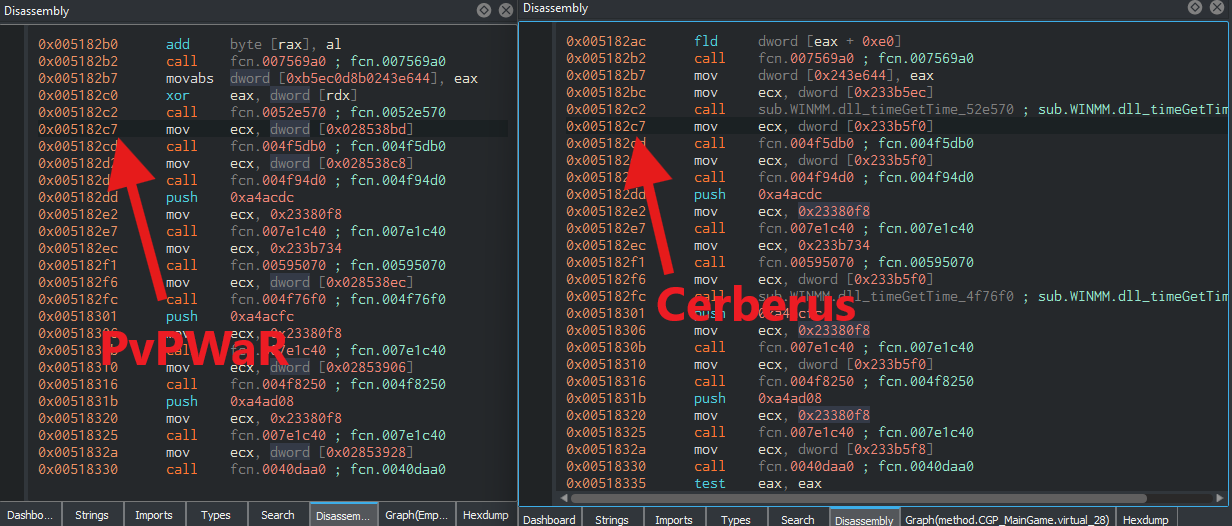 Fun fact: там, где на Цербе идут обращения к 233B5F0, на PvPWaRe всегда используются разные адреса, а не один и тот же.